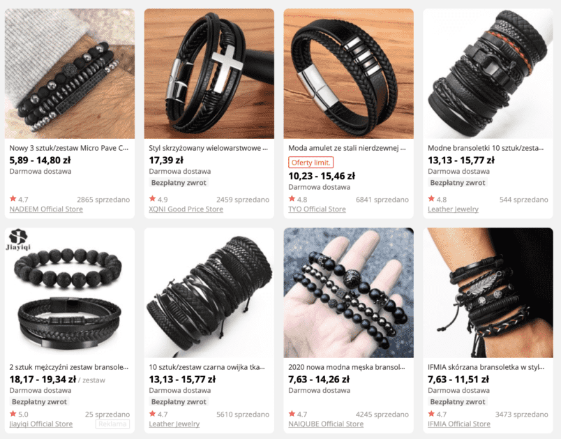 Bransoletki niedrogo możecie również kupić z Chin. Na AliExpress znajdziemy naprawdę olbrzymią ilość wzorów i materiałów, z których są one wykonane. Jeśli nie znamy rozmiaru nadgarstka mężczyzny czasem warto po prostu kupić elastyczną bransoletkę lub z regulacją.