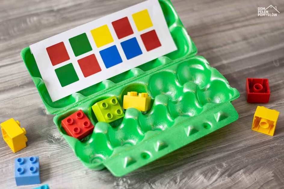 Z wytłaczanki po jajkach możemy zrobić prostą grę dla dzieci, która rozwinie ich umiejętności. Ma ona po pięć przegródek w dwóch rzędach. W nich dziecko będzie umieszczać kolorowe klocki według wzoru. Przygotowaliśmy dla Was kilka gotowych plansz, które wystarczy wydrukować i wyciąć. Przygotuj przedmioty w kolorach: niebieskim, zielonym, czerwonym i żółtym.