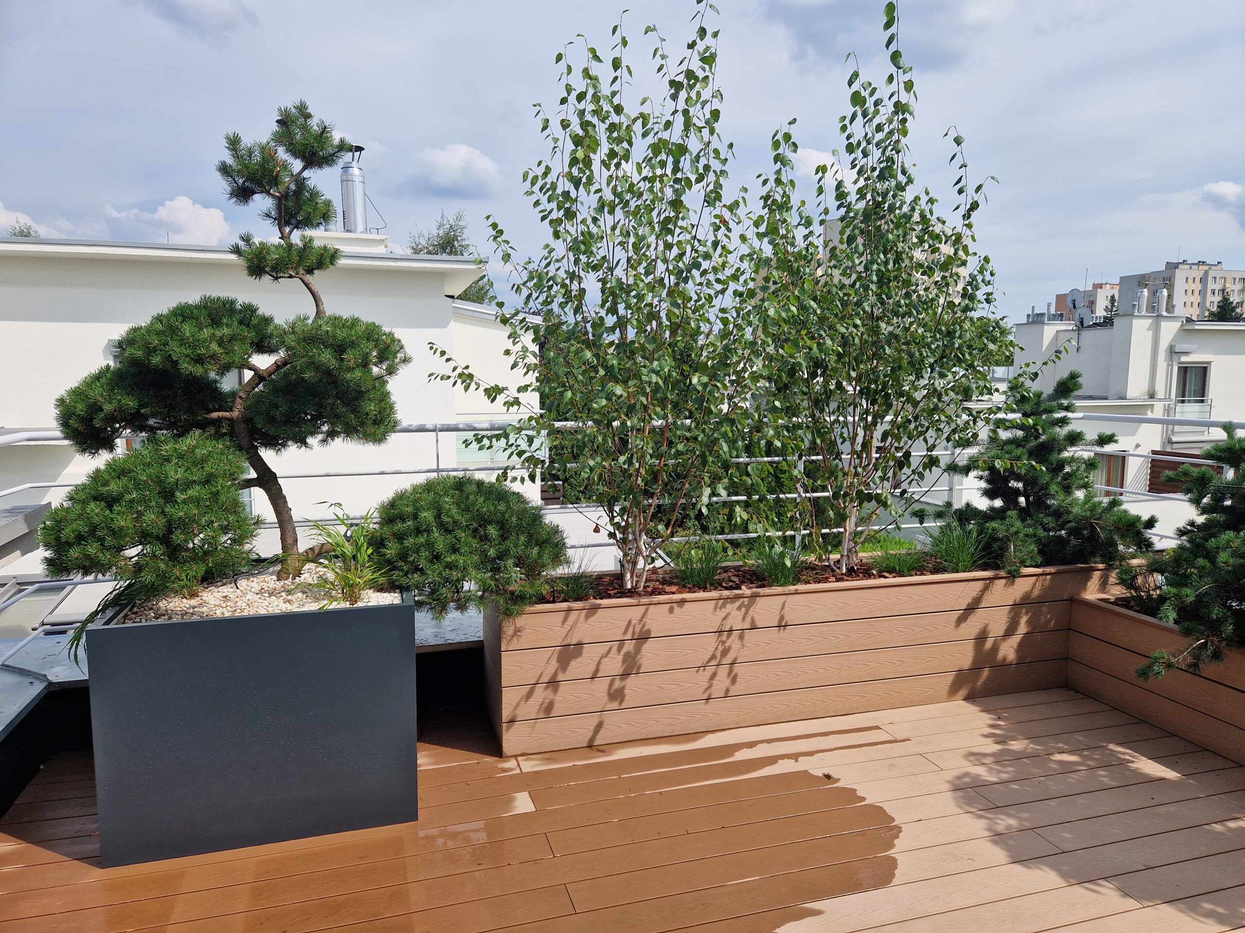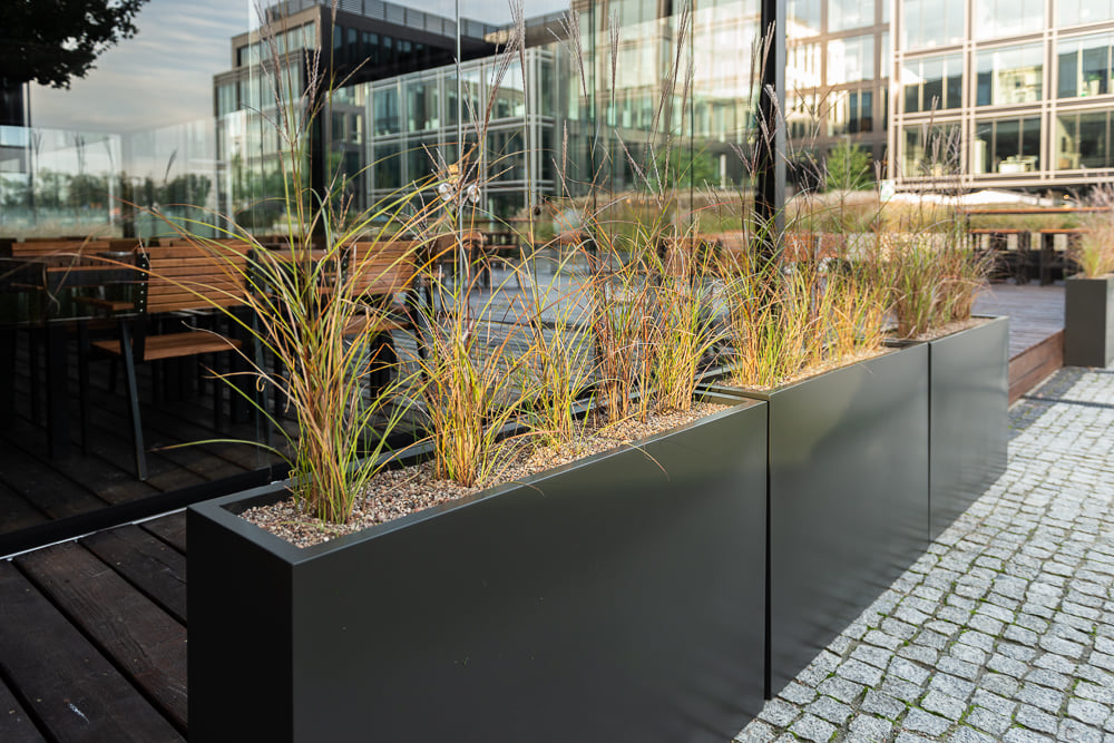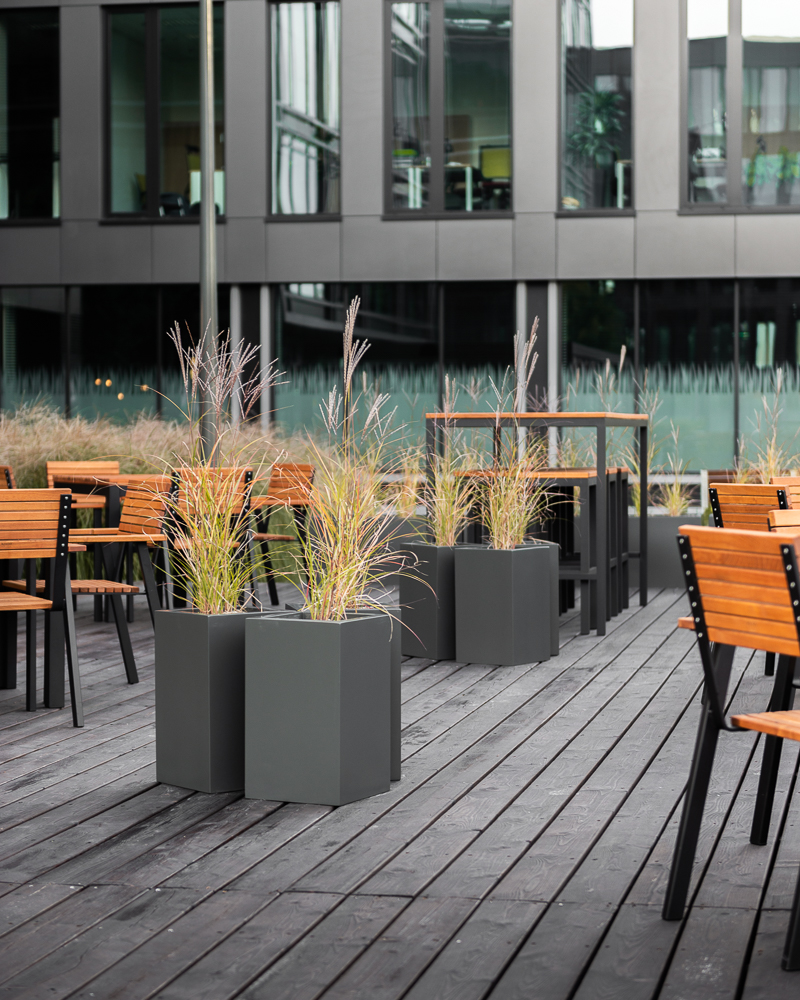 Jeśli wewnątrz masz antracytowe ramy okienne lub czarne dodatki, te same akcenty powinny pojawić się na zewnątrz. Tutaj z pomocą przychodzą rozwiązania dające pełną swobodę personalizacji, takie jak donice na wymiar. Dzięki możliwości lakierowania ich na dowolny kolor z palety RAL, możemy idealnie dopasować odcień donic do koloru sofy w salonie, zasłon czy elewacji. Taki zabieg sprawia, że wzrok swobodnie wędruje z wnętrza na zewnątrz, a taras optycznie powiększa przestrzeń życiową domu.