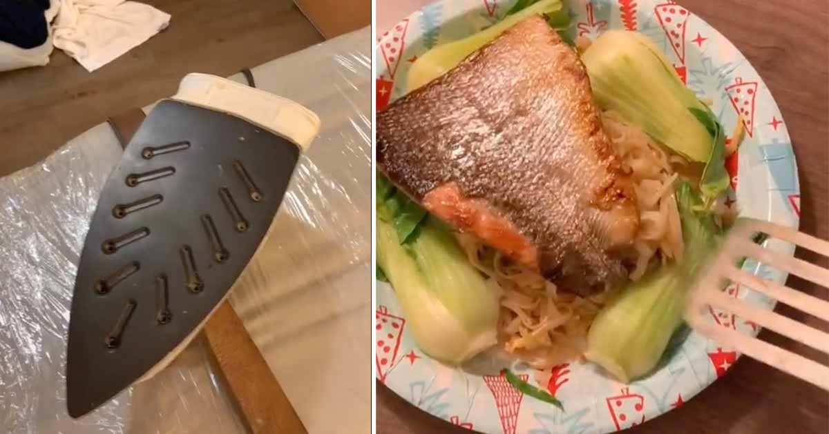 Na zdjęciu powyżej widzimy jak za pomocą żelazka i pergaminu upiekł kawałek ryby, a warzywa ugotował w czajniku elektrycznym na parze wkładając do niego kubeczek z dziurkami porobionymi na jego dnie.